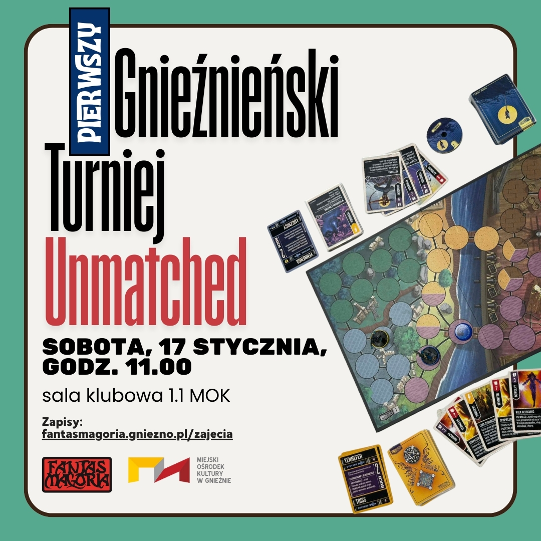 Stowarzyszenie Fantasmagoria oraz Miejski Ośrodek Kultury w Gnieźnie zapraszają wszystkich lubiących pełne emocji rozgrywki na I Gnieźnieński Turniej w grę planszową „Unmatched”, który wystartuje już w sobotę, 17 stycznia o 11.00 w Miejskim Ośrodku Kultury (Ogród Zimowy).