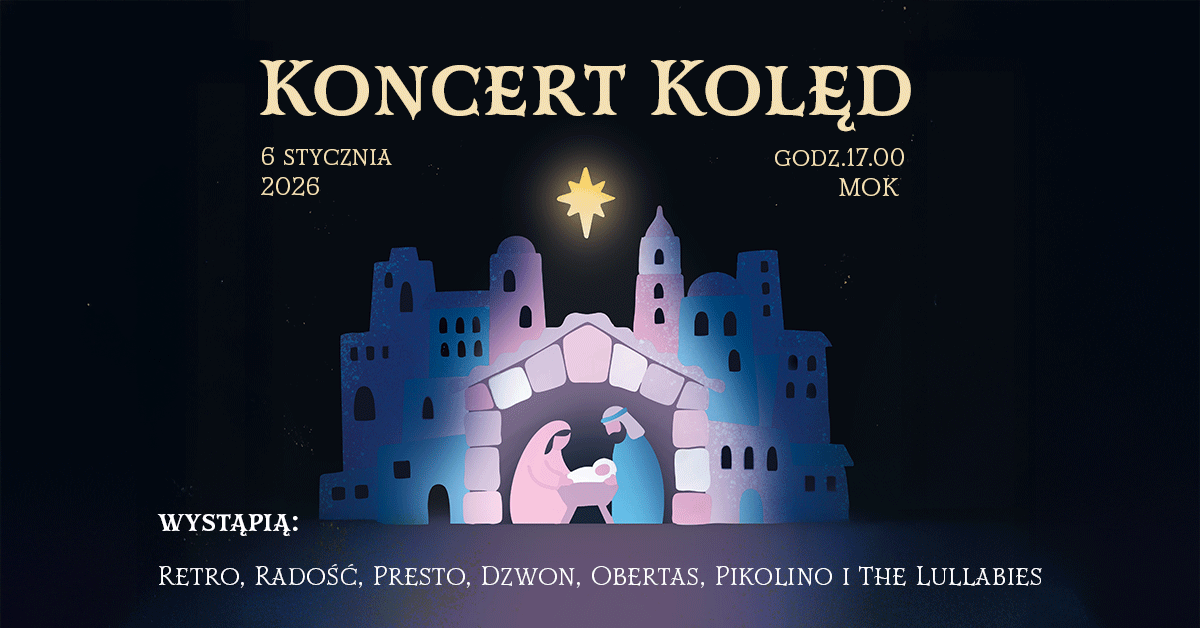6 stycznia 2026 roku o godz. 17.00 w Miejskim Ośrodku Kultury odbędzie się wyjątkowy Koncert Kolęd, który zgromadzi na jednej scenie zespoły wokalne, prezentujące zarówno tradycyjne kolędy, jak i współczesne, autorskie aranżacje.