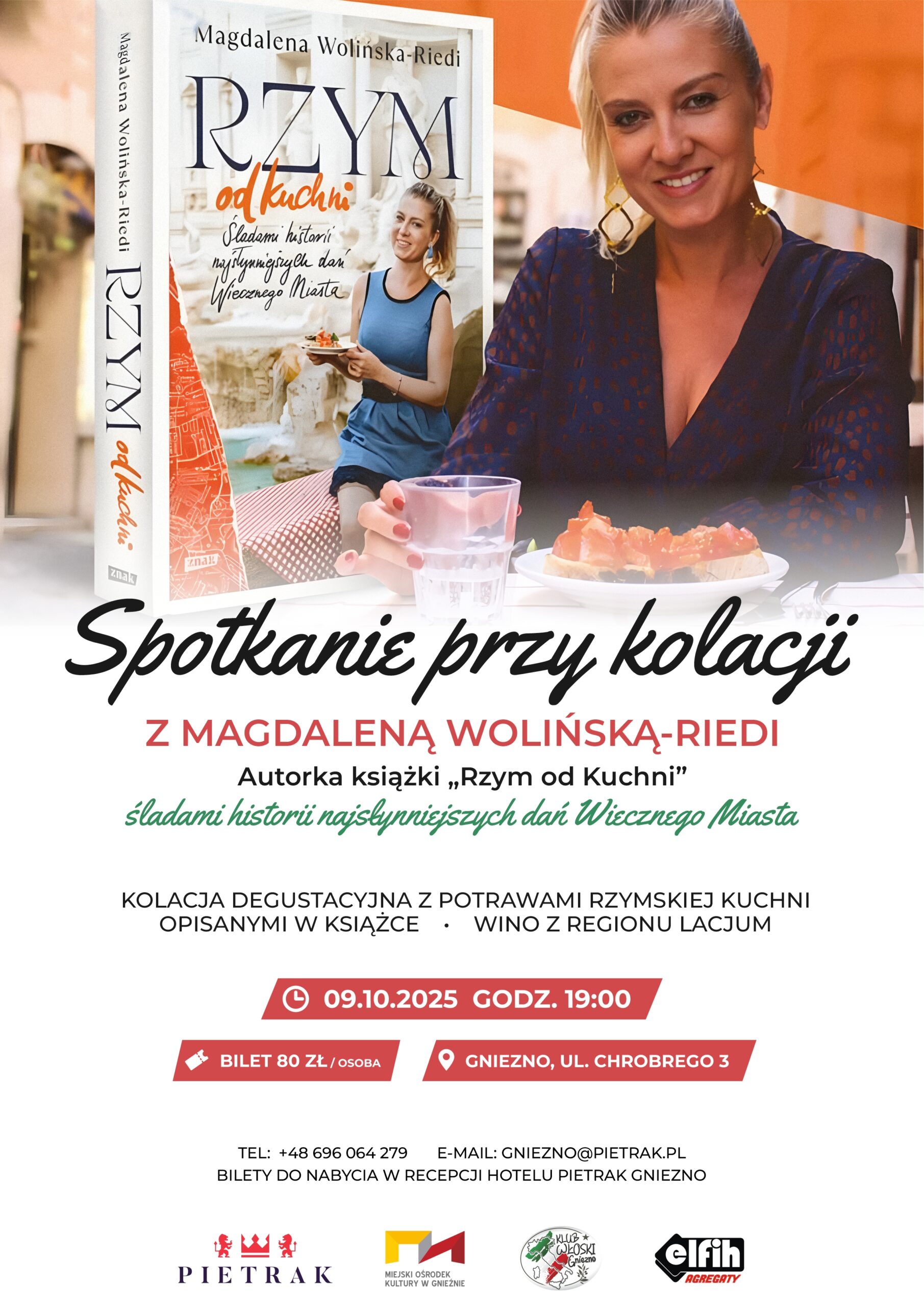 Mamy przyjemność zaprosić Was w dniu 09.10.2025 r. na godz. 19.00 do Hotelu Pietrak (ul. Chrobrego 3), w którym odbędzie się spotkanie przy kolacji z dobrze znaną Wam Panią Magdaleną Wolińską – Riedi – dziennikarką, reporterką, wieloletnią korespondentką zagraniczną z Watykanu, Włoch i obszaru Morza Śródziemnego, a także autorką książki „Rzym od kuchni. Śladami historii najsłynniejszych dań Wiecznego Miasta”, wokół której oparte jest wydarzenie, gdyż na spotkaniu przewidywane są potrawy rzymskiej kuchni opisane w wyżej wymienionym tytule.
