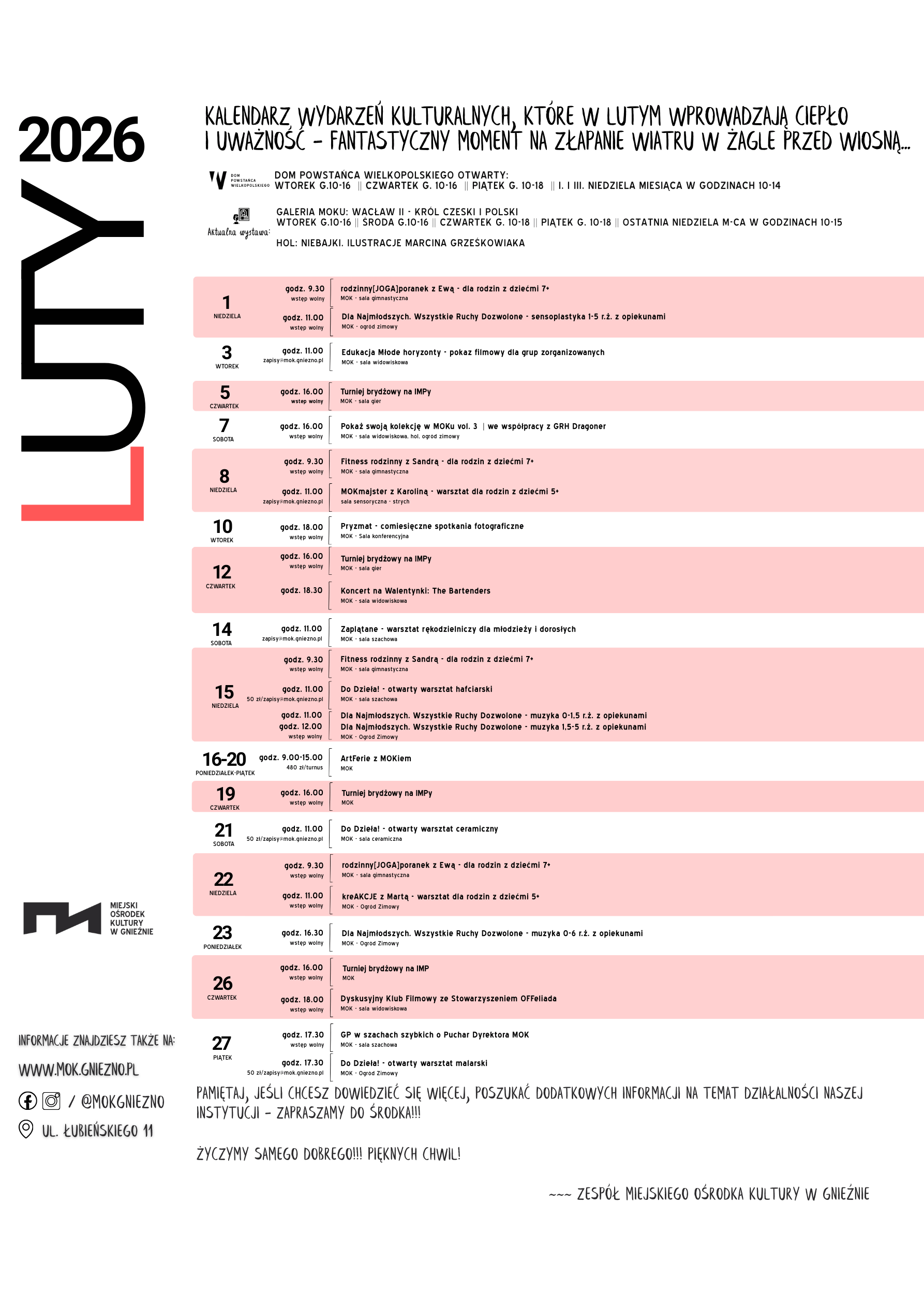 Zapraszamy wszystkich miłośników brydża na turniej! Jest to świetna okazja do wypróbowania swoich umiejętności i zapoznania osób o podobnych zainteresowaniach. Odbędzie się on 5.02.2026 o godz. 17:00 w MOK, sala